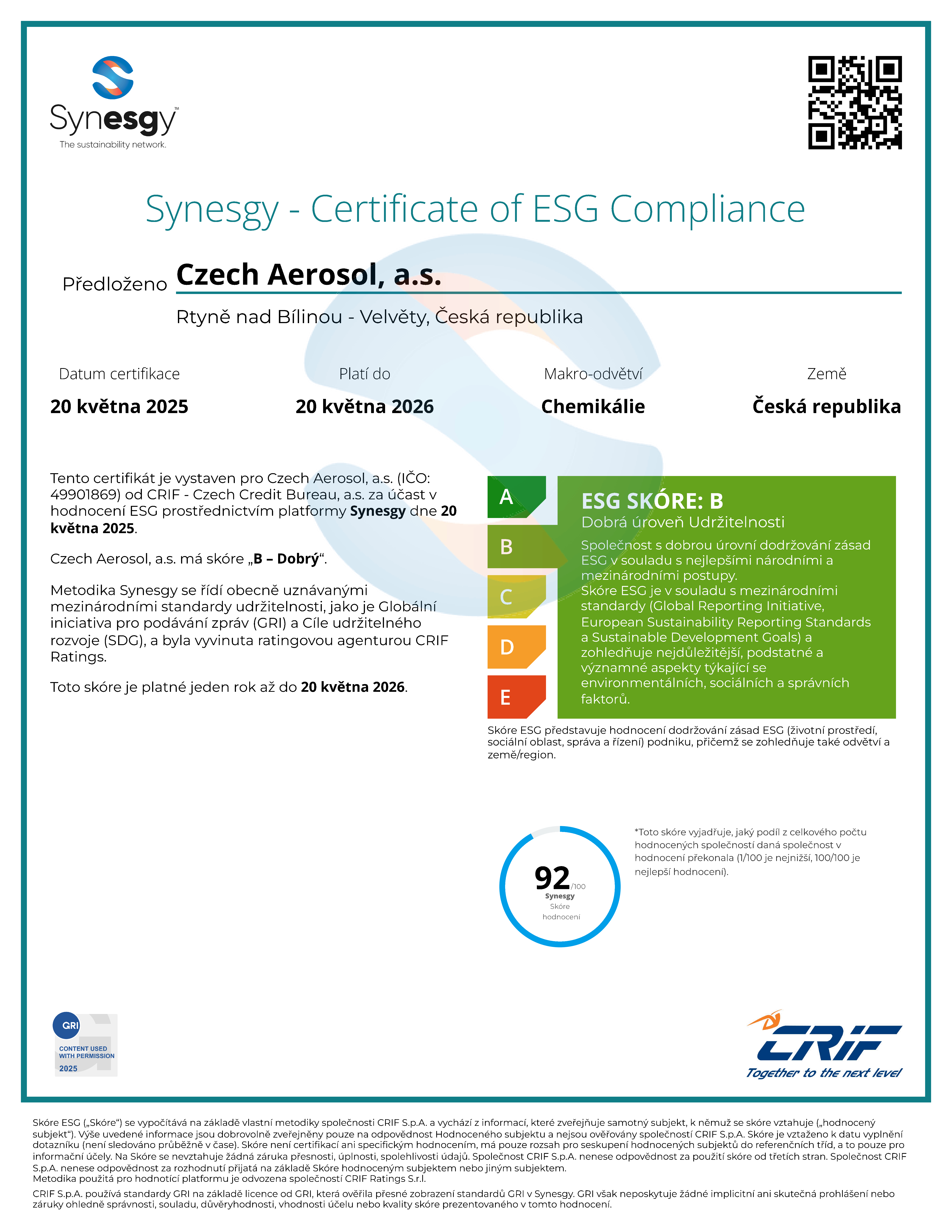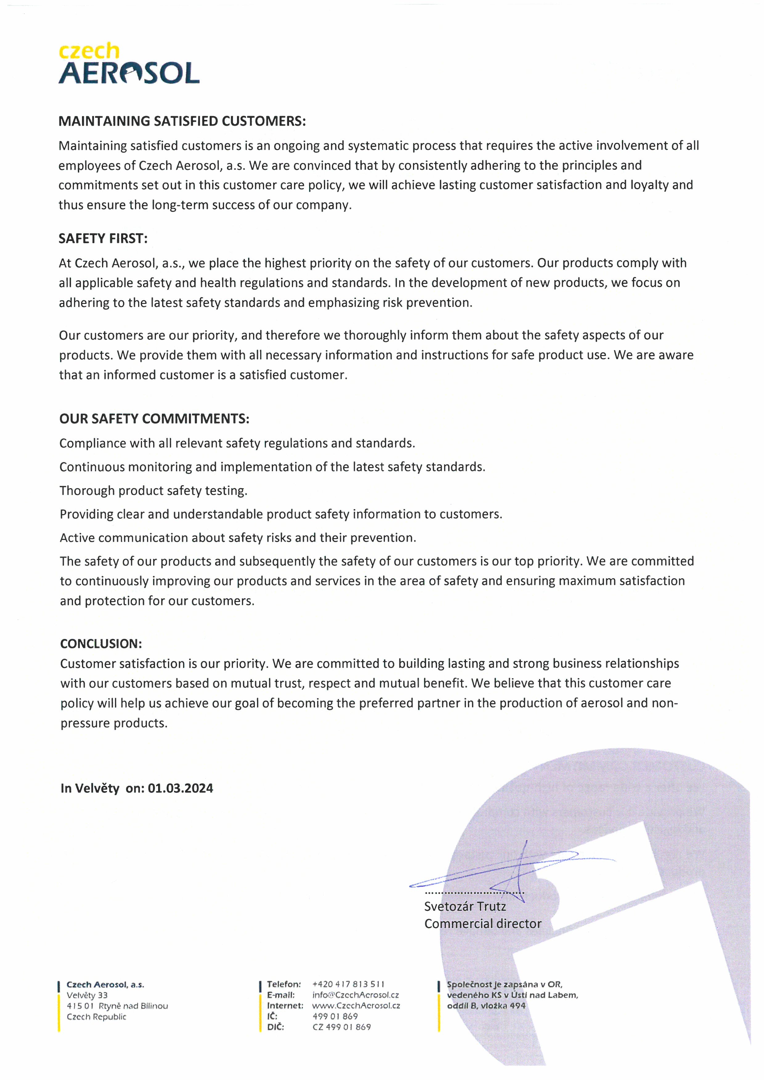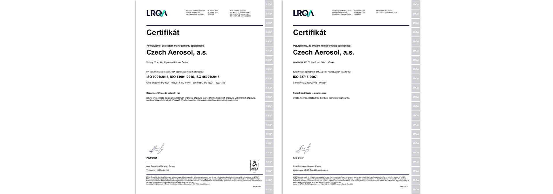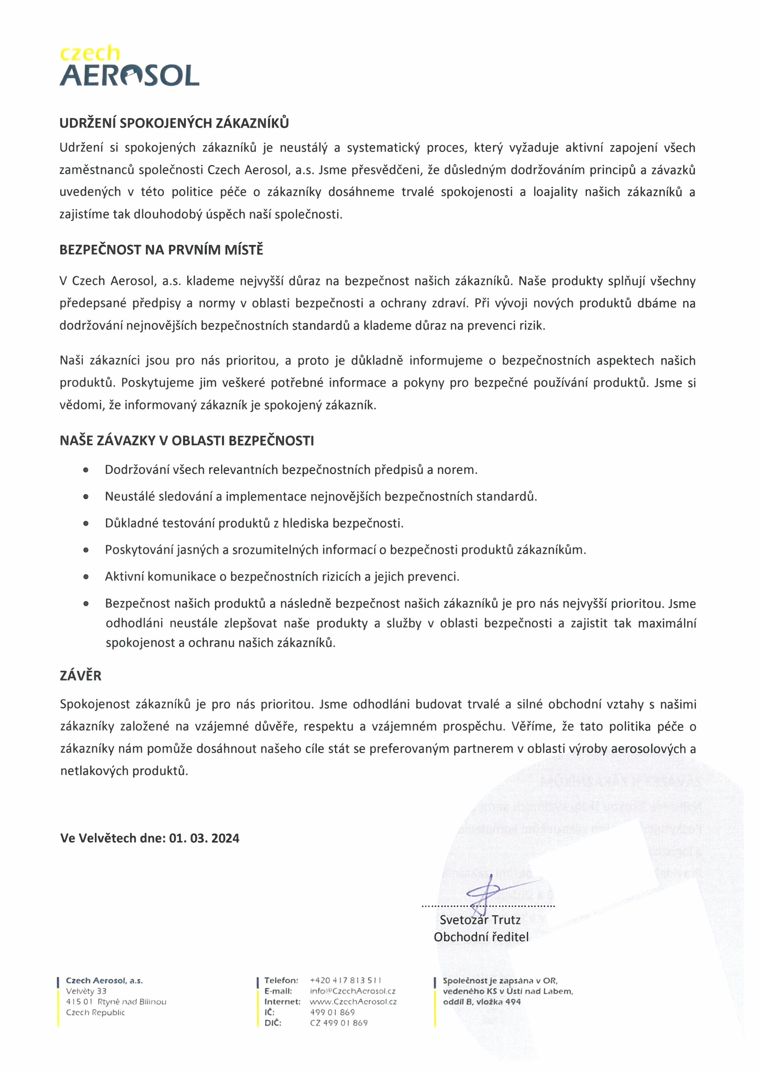 Garanci kvalitních výrobků zajišťuje nezávislé oddělení kontroly kvality. Czech Aerosol je certifikován ISO 9001:2015, ISO 14001:2015, ISO 45001:2018 a ISO 22716:2007.