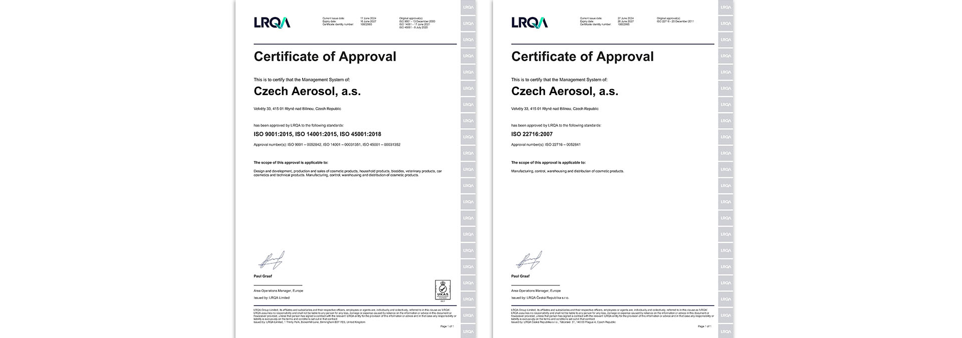 Top quality of all manufactured products is guaranteed by independent Quality Control Department. Czech Aerosol is ISO 9001:2015, ISO 22716:2007 and ISO 13485:2016 certified.